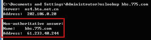 使用方法:nslookup+空格+域名,见下图 adress项则为该域名或二级域名指向的IP地址。