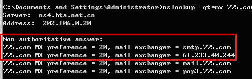 使用方法:nslookup+空格+-qt=mx+空格+域名,见下图
