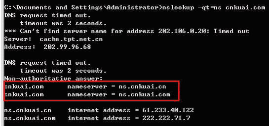 上图中给出了域名的两个DNS服务器,并且在下面给出了两个DNS服务器分别在互联网中的IP地址。 说明:nslookup命令的显示结果有时为超时,这并不能说明域名DNS服务器速度慢,只能说明客户端网络不通畅,请重新测试,即可成功。如果需要查看域名的别名记录(CNAME记录),则命令如下:nslookup+空格+-qt=cname+域名,即可得到域名解析的别名记录。