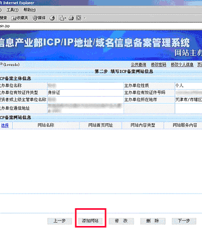 11、备案主体信息填写成功以后,出现以下网页,点击“添加网站”按钮,添加您的网站