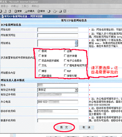 12、在填写网站信息时,如果您的网站涉及了前置审批或专项审批内容,请您选择相应的内容,如果您的网站没有涉及到前置审批或专项审批的内容,请您不要选择,以免造成备案无法通过,填写完毕后,点击提交按钮,见下图:
