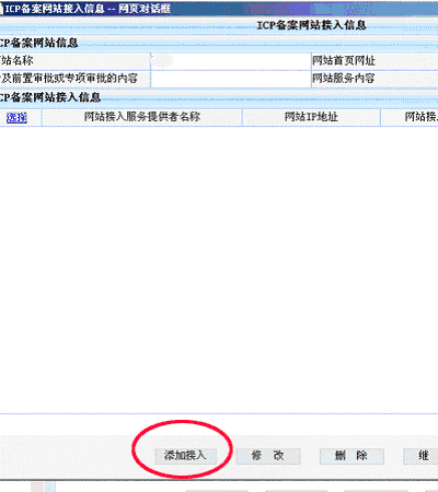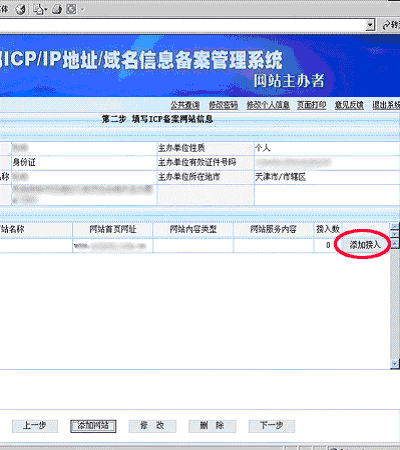 13、在第二步添写网站信息页面中,如果您没有多个网站需要同时备案,请点击右侧的“添加接入”按钮,见下图: