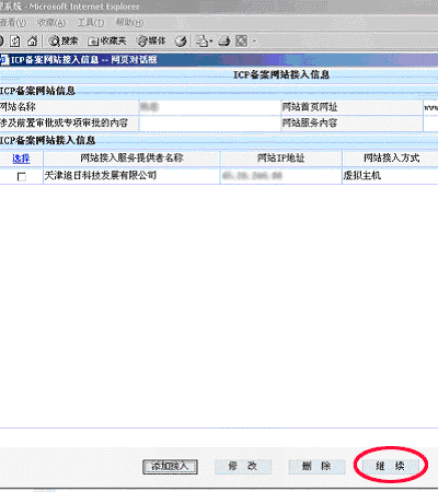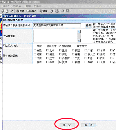15、在下面的接入信息录入栏中,接入单位名称,请填写我公司的全称“天津追日科技发展股份有限公司”;网站IP地址栏中,您可以登陆快网的控制面板,从控制面板的左侧获得您的IP地址;网站接入方式选择为“虚拟主机”;服务器放置地选择“天津”,然后点击提交。