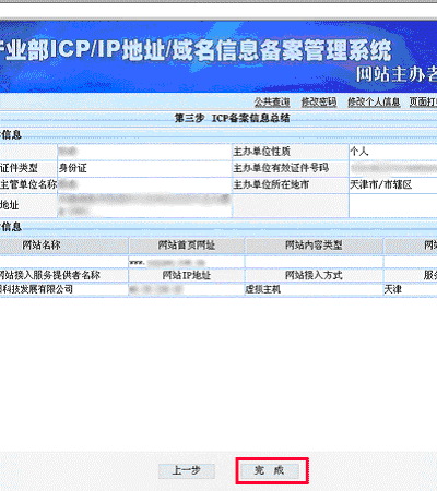 18、在第三步网站备案信息总结的网页中,点击完成按钮