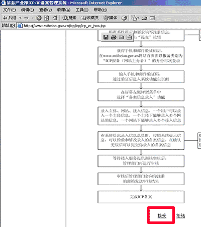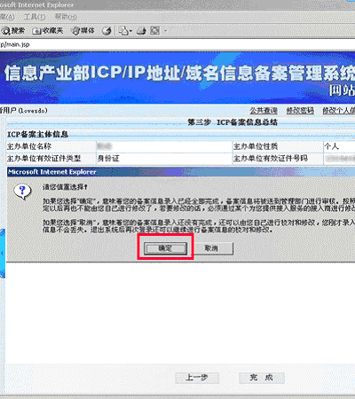 19、如果您确认自己的备案信息无误,则点击确安按钮,确定提交以后,您的备案信息则交给当地的通管局进行审核,在审核通过以前,您不可以自己进行修改。