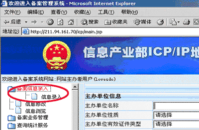 9、点击网页左侧的“备案信息录入—信息录入”输入您的备案信息