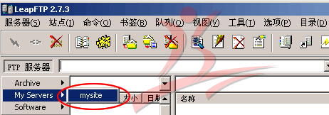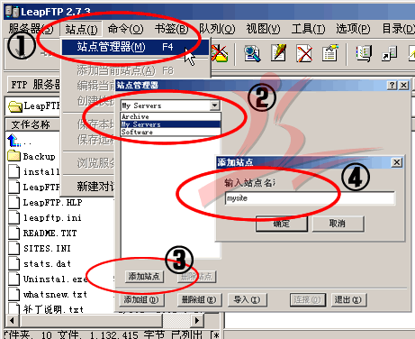 LeapFTP 使用方法:[假设您的域名为:abc.com,您的FTP用户名则为:abc] 1.请先下载并安装 LeapFTP 最新版本。您也可使用其它 FTP工具,请直接参考下面的设置方法。 2. 运行 LeapFTP,点击1处(站点->站点管理器),弹出“站点管理器”窗口;在2处选择“My Servers”项,然后在3处点击“添加站点”按钮,在弹出的窗口4处输入您喜欢的站点名称(如:mysite);