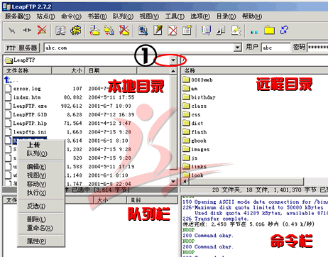 6.连接成功后的界面如下图所示。左上框为本地目录,您可以通过 1 处的下拉菜单选择您要上传文件的目录,选择后该目录下的所有文件都会显示在这个框里。 选择您要上传的文件,并点鼠标“右键”>“上传”, 这时在队列栏里会显示正在上传及未上传的文件, 当您的文件上传成功完成后,在命令栏里会出现“传送完成”的提示,此时在过程目录栏里就可以看到您上传的文件了。