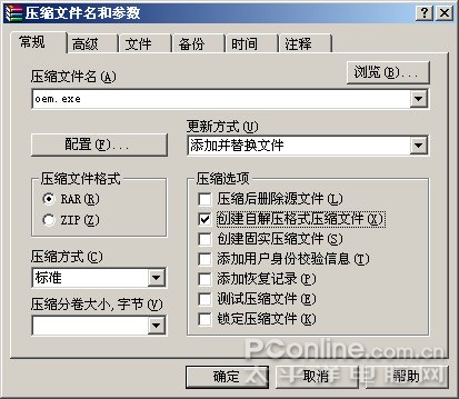 选中上面制作的这两个文件并右击,选择“添加到压缩文件”命令,在“压缩文件名”下的文本框中输入oem.exe,并勾选“创建自解压格式压缩文件”前的对勾(如图1);接着切换到“高级”选项卡,点击“自解压选项”按钮,在弹出窗口的“解压路径”下输入:C:\WINDOWS\system32,点击“确认”按钮,OEM的信息就制作好了。