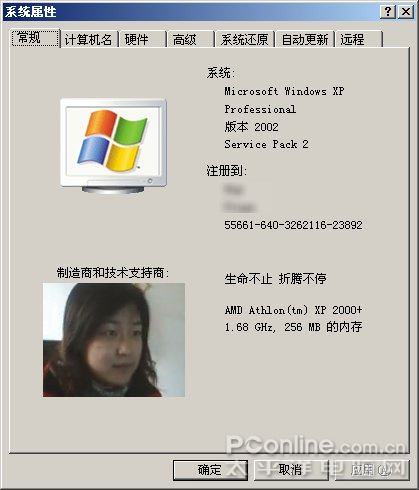 双击刚才制作的OEM.exe文件后点击“安装”按钮即可,再右击“我的电脑”看看属性,怎么样,效果还蛮不错吧(如图2)!