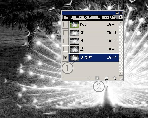 经过这样的调整之后,如标签1所示,在蓝色通道中,黑白最为分明,就用这个通道来制作吧。将蓝色通道拉到新建按钮上,将它复制一份。