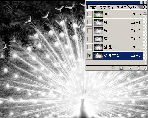 有朋友在论坛中发贴问我,怎样在杂乱的黄色背景下抠取白色孔雀羽毛。猛的一看,白色羽毛似乎很清楚,可是当用通道抠取的时候却会发现不是那么回事。每一个颜色通道中都有很多杂草的颜色与羽毛的颜色相似,无法用色阶区分开来。用黑色画笔也很难一点点把杂色修掉。