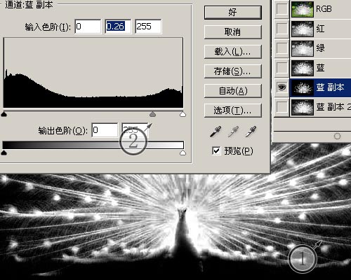 对蓝副本2通道进行色阶处理,如标签1所示,保留更多的羽毛。