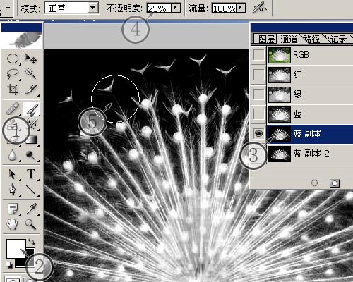 进入蓝副本通道,选择一个较软的画笔,使用白色,降低画笔不透明度,在羽毛损失比较厉害的地方涂一涂,可以看到羽毛会被慢慢加上。注意,不要把杂草的图像也给涂出来。这个方法可以结合两个通道的优点,而将多余的部分完美地过滤掉。