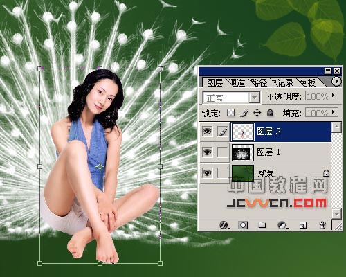 将女孩图层放在最上层,CTRL+T自由变换,按着SHIFT键可以保证人物图像不会变形。把人物缩小到合适大小。