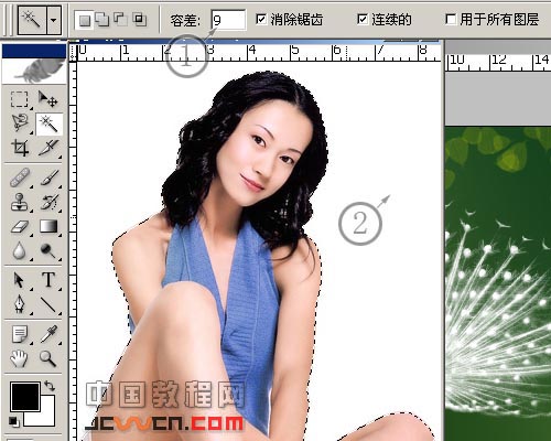 打开女孩的图片素材,我们要把女孩图像抠出来,相信学习这个抠图的读者抠取这个图像没有任何问题。用磁性套索也可以,用魔棒选择外边的白色部分,再Ctrl+shift+I反选,直接用移动工具拉入图像中。
