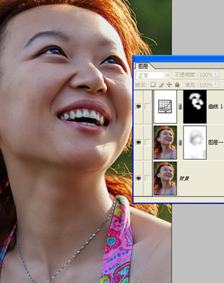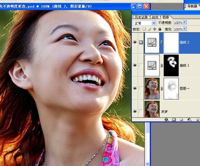 MM由于脸上有痘痘的原因,有的地方偏红,我们加一曲线调整图层较正一下-