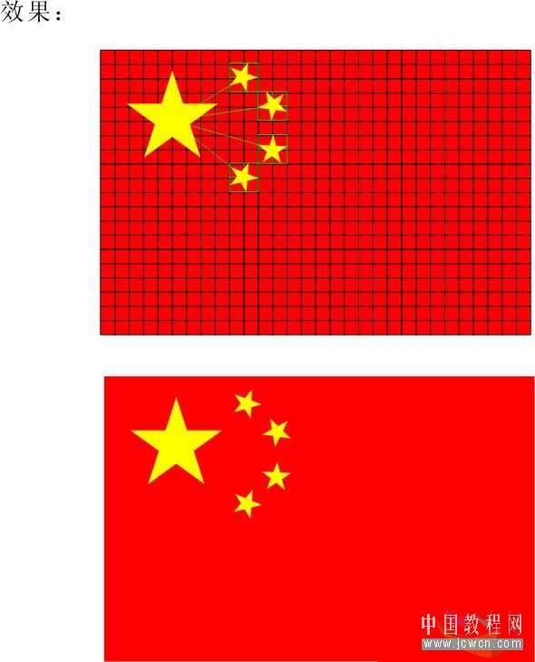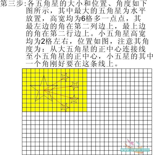 三、各五角星的大小、位置、角度如下图所示,其中最大的五角星为水平放置,高宽均为6格多一点点,其最左边的角在第二列边上,最上边的角在第二行边上。小五角星高宽均为2格左右,位置如图,注意其角度为:从大五角星的正中心连接线至小五角星的正中心,小五星的其中一个角刚好要在这条线上。