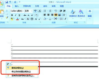 另外,如果你不想Word 2007自动将这些符号变成横线,则可以单击横线旁边的闪电图标打开设置菜单,点选“撤消边框线”一项,即可将横线还原成符号。或者,你也可以点选“停止自动创建边框线”项目来停用这项功能如图。