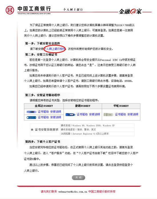 (2)首次支付前,先登陆工行网上银行安装驱动、下载证书