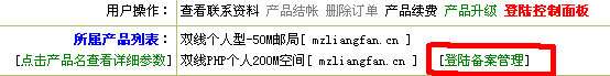 二、直接在快网会员后台=>我的产品管理=>已付款的产品=>对应的空间/套餐/托管租用类订单,点击订单号后出来的页面登陆(在原来登陆控制面板连接下面,所属产品列表中),如下图: