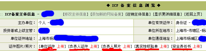 五、上图划红线的部分,需要您上传单位证件(如果是个人请上传身份证正反面);负责人证件(身份证正反面,企业要求是法人的);负责人照片(负责人照片请上传单色背景的半身照片,建议到照相馆去照,比一寸证件照多要求的是要把肩膀照全了!!!);真实性核验单;网站安全责任书.