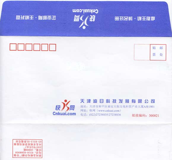 快网委托中国邮政总局印制的标准专用信封(小号不带邮资)