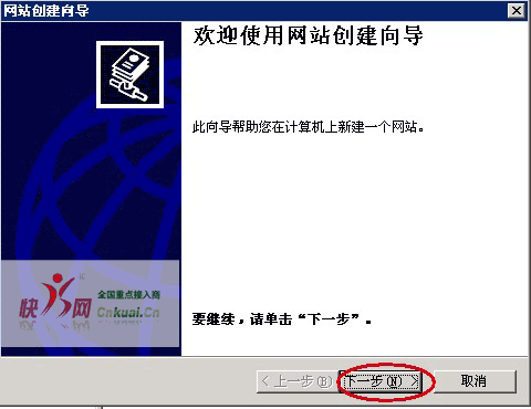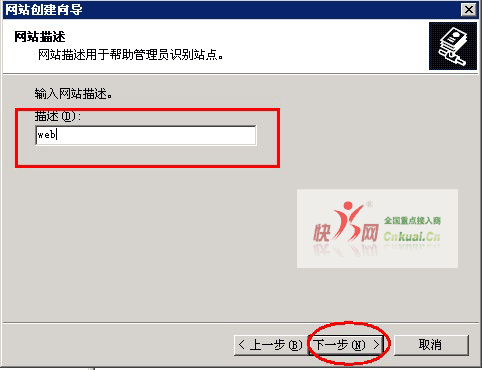 五、描述就是指的网站名称,将来显示在IIS管理器中,请输入您方便区分的名称;然后点下一步;