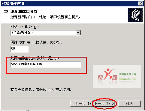 六、此网站主机头,就是您默认绑定的域名,请输入您要绑定的网站域名(说明:如果为空,什么也不写,就是接收解析到该服务器IP上的所有域名,一般国内空间因为需要备案,不要为空,以避免个别人把没有备案的域名误解析到您的服务器,出现未备案网站!!!);