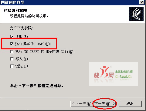 九、这一步要选中运行脚本,如下图,(如果不选运行脚本,那么您的网站将只支持静态网页,如.htm 或.html后缀的网站,不能支持ASP/NET/PHP等动态脚本)。记住没有特别需求,只选中运行脚本就可以了,如果再选中下面的选项,可能会造成安全问题!!!