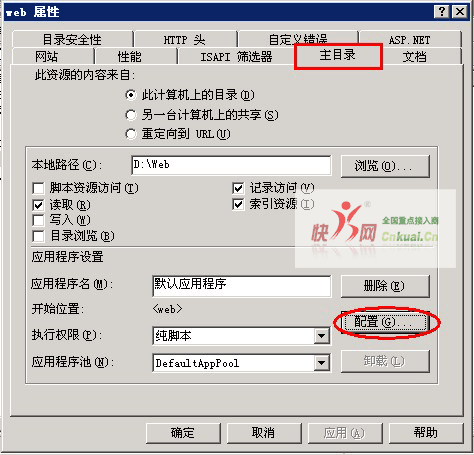 在IIS站点名称,右键属性,出来的窗口中,有一项主目录,如下图所示;点击主目录后,下方有一个配制;点击。