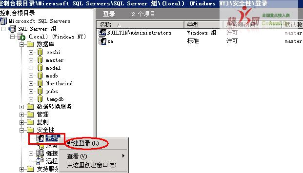 在左侧,点击安全性,展开后,有一个登陆,在登陆上面,右键,新建登陆;