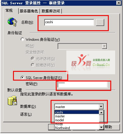 五、在弹出的新窗口中,输入您要创建的用户名,选择SQL Server身份验证,输入用户的登陆密码,最下面那一块,选择该用户登陆后的默认访问数据库;