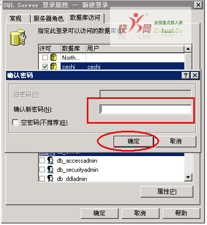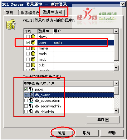 六、接着,点击数据库访问,给该用户访问指定数据库的权限,如下图所示,选择数据库,数据库角色中允许的权选要选中db_owner(一定要选噢,不然是没有相关权限的);