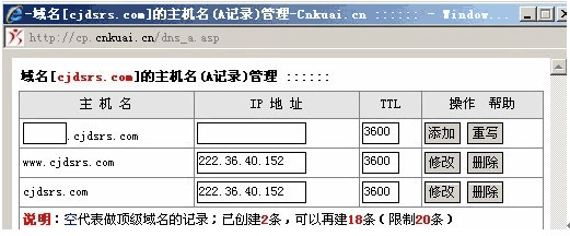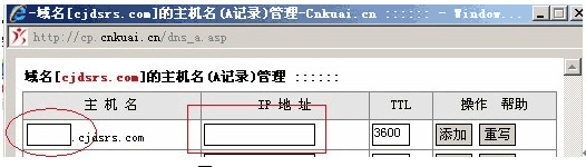 您可以看到红色方框标记的是填写您空间IP地址的地方,红色椭圆形标记的地方请注意,一般解析的时候 需要添加两条解析,一条是椭圆形标记的地方填写www,另一条是椭圆形标记的地方为空,就是什么都不用填写。
