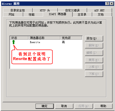 9、重启IIS后,再次选择站点,右键,属性,看到如下所示向上的绿箭头,说明 IIS Rewrite 成功添加并运行。