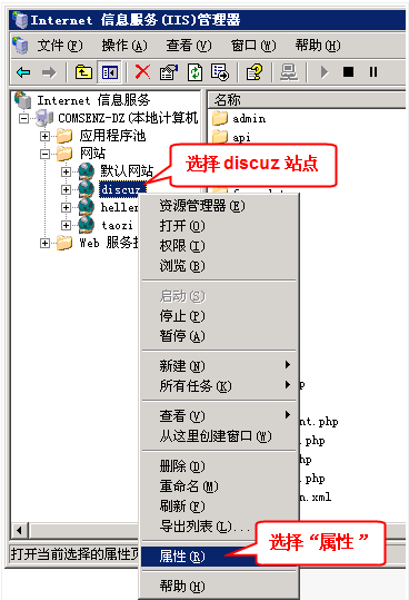 2、在 IIS 管理器里选择网站,右键选择“属性”,如下图所示: