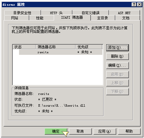 下载安装后重启ISS 网站配置好 httpd.ini 可直接使用 注意:这个我想必须写在前面,安装的时候请注意下 如果您Rewrite出错的解决方法: 主要是权限问题 ISAPI_Rewrite默认安装在 C:\Program Files\Helicon\ISAPI_Rewrite 如果c:\program files 目录权限在安装前设置为everyone可访问 ISAPI_Rewrite安装就没问题 但如果安装前c:\program files目录设置为admin和system可访问 则ISAPI_Rewrite安装后出错 无法加载 重设ISAPI_Rewrite权限也没用 解决办法: 1. 如果之前已安装无法加载. 先卸载ISAPI_Rewrite 这时ISAPI_Rewrite目录还是存在 设置权限为everyone可访问 然后再安装载ISAPI_Rewrite 一些OK. 2. 如果未安装 先自己建个C:\Program Files\Helicon 目录 设置权限为everyone可读 再安装.