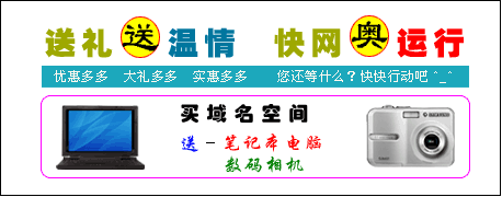 活动时间: 2008年6月28日 至 2008年8月24日 心动马上行动^_^ ... ... 立即注册新会员 老会员登陆 活动内容: 1、消费额>=15000元,赠送“神舟 天运 笔记本”一部; 2、消费额>=8000元同时<15000元,赠送“三星 19英寸 彩色液晶显示器”一台; 3、消费额>=5000元同时<8000元,赠送“三星 S860 数码相机”一部; 4、消费额>=2500元同时<5000元,赠送“iPod/苹果 2GB MP4”一个; 5、消费额>=1300元同时<2500元,赠送“纽曼 MOMO 2GB MP3”一个; 6、消费额>=900元同时<1300元,赠送“金士顿/kingston 2GB U盘”一个; 7、消费额>=500元同时<900元,赠送“快网精美鼠标垫”一个。 心动马上行动^_^ ... ... 立即注册新会员 老会员登陆 活动规则: 1、凡快网的普通会员均可参加(代理会员不参加本次活动); 2、消费额是指:某一快网会员,在活动期间购买快网指定服务的总金额(包括续费); 3、以登陆用户名为一个参加活动单位(即:一个用户名视为一个会员); 4、主机租用和主机托管的消费金额不参加本次赠送活动; 5、凡是已经优惠或打折的产品,不再享受本次活动优惠。 其它说明: 1、本活动的最终解释权归天津追日科技发展股份有限公司; 2、赠送礼品将于2008年 9月15日前,由我公司统一寄出; 3、赠品图片及说明仅供参考,具体实物以收到的为准。 咨询电话:022-27238835/36,27233992/93,27232077/78 公司网站:快网(www.cnkuai.cn)