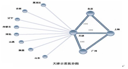 • CHINANET 基础电信资源 CHINANET 是国内最早的互联网络之一,截止到2003 年7 月31 日物理节点覆盖全国31 个省(市、区)的200 多个城市,业务范围覆盖所有电话通达的地区。CHINANET骨干网由北京、上海、广州、沈阳、南京、武汉、成都、西安等8 个核心节点组成的核心层和其它54 个汇接节点组成的汇接层组成。全网有3 个国际出口,通过京、沪、穗的路由器完成。国际路由器与国内路由器独立设置,并负责实现各国际策略及安全性限制。CHINANET 网络节点间的中继电路采用基于SDH 和DWDM 的光纤网络,网络总带宽超过800G,国际出口总带宽已超过5000Mbps,实现了宽带化、高速化,是目前国内传输带宽最宽、覆盖范围最广、网络性能最稳定、信息资源最丰富、网络功能最先进、用户数量最多的计算机互联网。 • 天津电信节点在CHINANET中的位置 天津节点在CHINANET北方节点的北方诸节点中的位置非常重要,其地位仅次于北京。现有3条10G直连线分别接入京、沪、穗三个国际出口,并各有直连线连接北方其余8省市,其网络性能快速稳定。其网络拓扑图如下: