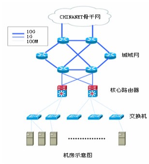 核心层由两个核心节点组成,大双出口实现与Chinanet 骨干网的互联。汇聚层:城域网的汇聚层由9个分局节点组成,核心及汇聚层均采用10G线路相连,汇聚与接入层均采用2.5G线路相连接。汇聚层负责汇集分散的接入用户,进行数据交换,提供流量控制和用户管理功能。核心和汇聚节点一起构成了城域网的骨干。接入层:提供各种类型的用户接入,在有需要时提供用户流量控制功能。 天津电信IDC机房基础设施介绍: 天津电信IDC 数据机房位于天津电信中心天波局中,提供的基础设施包电信级的机房场地、机房环境保障;高速稳定的网络保障;充足持续的电力保障;严密的安全保障;可靠的消防保障;高水平的技术支持。机房示意图如图: