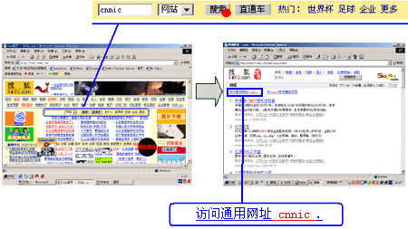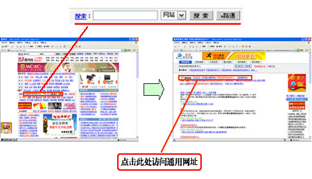 以网易为例: 用户在网易的网站搜索中输入搜索词,点击搜索按钮后出现网易的搜索结果,在搜索结果的首行,有通用网址的文字链接,点击此文字链即可实现访问通用网址的功能。